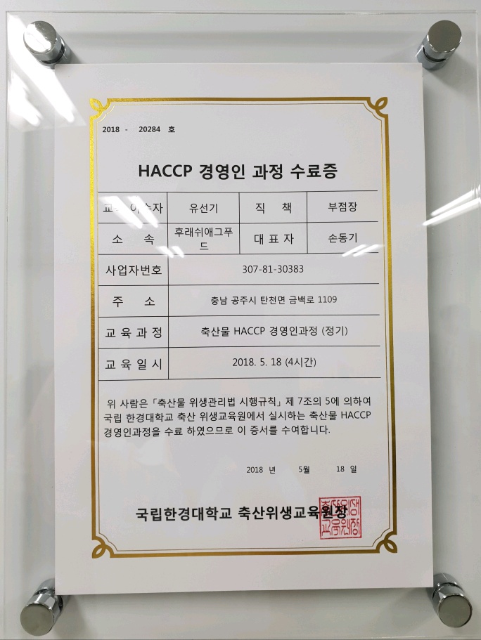 HACCP 경영인 과정 수료증 페이지 정보 작성자 관리자 작성일18-09-05 16:25 댓글0건 관련링크 이전글 목록 본문 HACCP 경영인 과정 수료증 댓글목록 등록된 댓글이 없습니다. 이전글 목록
